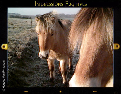 Au point du jour, je pars sur les chemins. Je suis seul, l'air est piquant, la journée est belle. Ils sont deux à m'accueillir et à me suivre un moment, jusqu'au bout de la prairie.