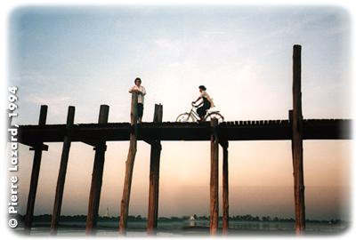 Raccourci privilégié pour les paysans et royaume des vélos..., le pont U Bein, long de plus d'un kilomètre et vieux de plus de deux siècles, enjambe un bras du lac Taungthaman; surplombant une bande de terre fertile et les berges du lac où barbotent des centaines de canards, il a été construit avec les poutres en teck de palais détruits. |