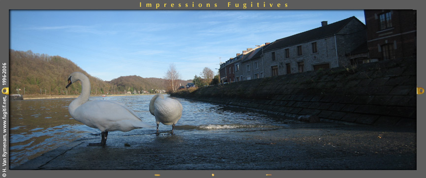 Deux cygnes et trois canettes. Sclayn est un village de Meuse.