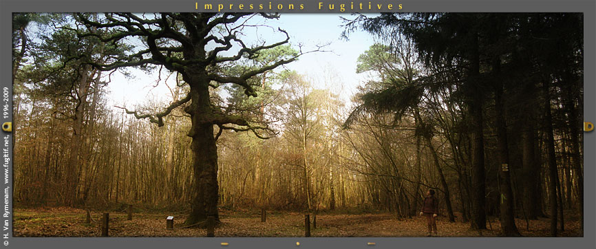 Au bout de la route, une clairière et le chêne à l'image. Autrefois, les pèlerins soulevaient un morceau d'écorce pour y glisser une image pieuse. D'où, les boursouflures du tronc... Et, le nom de l'arbre... |