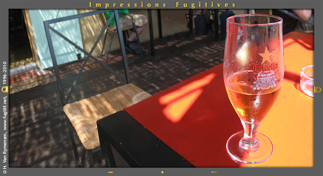 Sous les canis, on y boit de l'Estrella, la bière de Barcelone. Devant nous, rapide et fluide, passe un skiff. Juste quelques remous... Parfois un couple, va fumer une cigarette côte à côte, assis dans l'herbe et les pieds dans l'eau du canal... |