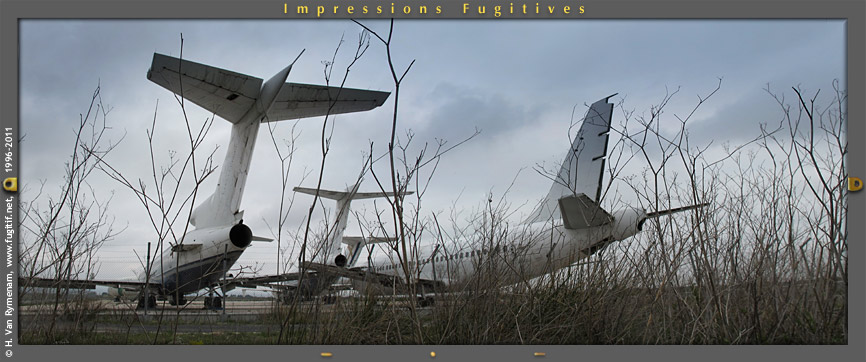 En fin de piste... Au sein d'une mangrove d'acier, de vieilles carlingues déglinguées, envahies d'herbes folles, ont abandonné tout espoir transcontinental...
