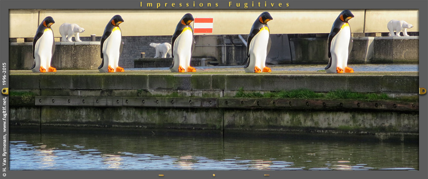 Débâcle. A l’occasion de la conférence sur le climat, des manchots arpentent en bon ordre les murs de l’écluse de la Plante. Tandis que les ours contemplent la débâcle…