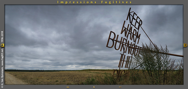 En français Restez chaud, brûlez les riches. C’est un slogan découvert sur un mur du quartier anarchiste d’Athènes. C’est aussi l’oeuvre emblématique du Vent des Forêts 2017. Un slogan comme brandi à bout de bras face à la campagne meusienne… (à suivre…) Keep warm burnout the rich. est une oeuvre de None Futbal club réalisée dans la cadre du Vent des Forêts 2017. |