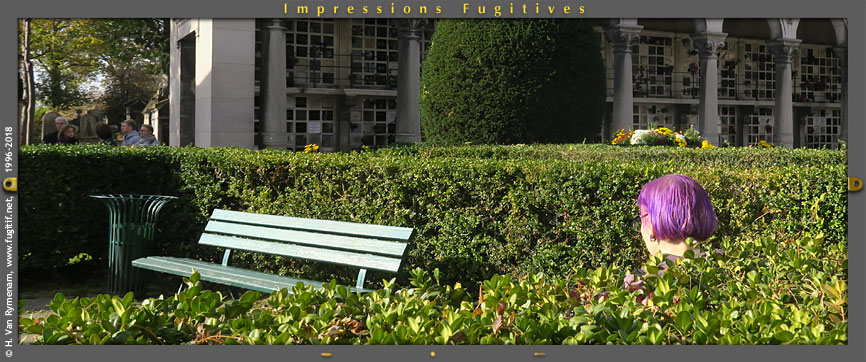 Le Père-Lachaise (3/7) - Dans le parc du columbarium. Ses cheveux étincelaient d’une couleur de deuil. Dans le parc du columbarium, on respirait des odeurs de buis et le vert se mêlait au noir et au mauve… (à suivre…)