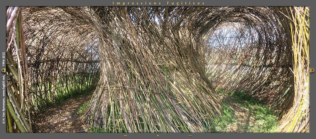 Le village du Saule (2/5) - Cocon. On s’y tient debout ! On s’y promène dans une lumière tamisée par les branches tressées. C’est un superbe cocon, réalisé uniquement en osier… (à suivre…)