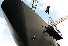 C'est d'ailleurs presque impossible d'avoir une conversation de plus de 30 secondes avec lui. Sans cesse, son portable sonne : un ouvrier qui a besoin d'éclaircissements sur un détail de plan, un client, un problème à résoudre, ... ça n'arrête jamais ! Cela fait 27 ans qu'il travaille au chantier. Quelques jours après être sorti de l'école, il est entré ici comme mécanicien d'entretien. Et, il y est resté, devenant le chef de l'équipe. Peut-être, parce que ce sont les difficultés qu'il préfère dans son travail. Il me confie cela, avec un petit sourire en coin.Car les problèmes ne manquent pas dans ce genre de construction particulièrement complexe. Mais cela lui permet de garder la forme et surtout, de rester sur le terrain, hors des bureaux. Aujourd'hui, c'est un moment très particulier pour André Franquinet. Il est le responsable de la mise à l'eau, moment le plus délicat et le plus stressant de toute la construction. Les huit cent tonnes du bateau doivent descendre doucement et sans faux mouvements.- "Il faut mettre tous les atouts de notre côté, me confie-t-il, il faut être très attentif pour descendre le bateau, regarder à tout et prendre son temps. Surtout, ne pas plier la coque." Mais déjà, il est temps de le laisser. Son portable s'est remis à sonner... |
